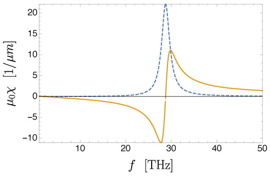 It must be pointed out that the above equation is only approximate. As a matter of fact it is easy to see that if we had kept the term in we would have generated a real term, , in the denominator of Equation (45), which can be interpreted as a dynamic depolarization effect [46]. The obtained term would still be incorrect, as additional terms of the same order in would appear from taking into account that the electric field inside the nanoparticle is not constant. An exact treatment using Mie’s scattering theory for a spherical particle would lead to [45,47]