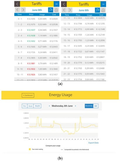 Visualization of Home Energy Management System in natural experiment—Translated from Dutch. (a) displays an electricity tariff overview on mobile devices and (b) a household electricity usage dashboard.