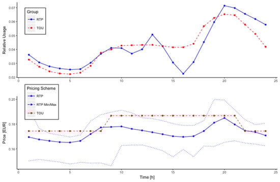 We verify different behavior between the tariff schemes in two steps. First, we verify demand shifting behavior for both treatments analyzing relative electricity usage throughout the day. We set the dependent variable in (1) to electricity usage relative to total daily usage , comparing daily usage across treatments. The updated coefficient estimate is two-dimensional, consisting of the main effect for price and control effect for solar influx. Figure 3 visualizes the relative electricity usage and the average daily electricity price for both tariff schemes. Load shifting behavior occurs more dominantly in the RTP treatment as expected, occurring between 3 p.m. and 9 p.m., corresponding to higher prices for electricity usage. This is compensated for by relatively higher demand from late evening until late morning.