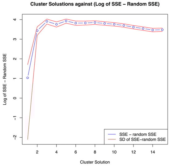 We evaluate the appropriate cluster solution, by examining the absolute differences between the original and random sum of squared errors (SSE) against the chosen cluster solutions. The appropriate cluster solution is given by the solution where the actual SSE differs the most from the mean of the random SSE. This process is shown in Figure 4, giving evidence for selecting 5 as the appropriate number of clusters. We thus proceed with the five strongest variables, of which the first two components explain more than 80% of the point variability of the entire data set.