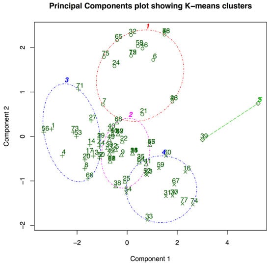 The visualization of the k-means clustering is given in Figure 5 against the two strongest principal components, segmenting the data set into clearly distinguishable clusters. The k-means clustering analysis resulted in a cluster sum-of-squares of 84.31. The two strongest principal components explain 78.17% of the point variability within our sample. Each of the five identified clusters of this study should be seen as an archetype that categorizes the households across our sample, with the respective individual within-cluster variance given within brackets: