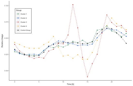The relative electricity usage across clusters and TOU (control) group is visualized in Figure 6. Cluster 3 is showing extreme behavioral deviations in their relative electricity usage. Comparing it to the relative electricity usage of our control group, it becomes evident that Cluster 3 exchanges part of its daily energy consumption to early noon hours, and saves high amounts during afternoon hours, when the electricity prices are starting to rise again. In addition, Cluster 4 is shows a similarly favorable relative load profile for the Real-Time Prices. More specific, Cluster 4 has an above average relative electricity usage during early morning and late evening times, which are usually the times in which the prices are comparably low. Lastly, Cluster 1 and 2 have very similar relative load profiles compared to the control group.