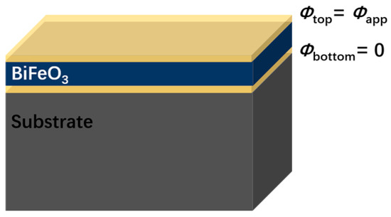 in which is the kinetic coefficient related to the domain-wall mobility. In the model setting, we consider an epitaxial grown BFO film on a rigid substrate in the direction, as shown in Figure 1. Dimensions of the film are set as , in which is the grid number for the film thickness, and is the grid size in the simulation. In the present work, is set as 1 nm. A periodical boundary condition is applied along the and axes. A thin film mechanical boundary condition is adopted in this simulation [33]. As for the electric boundary condition of the film, a short circuit condition is applied in this model [34]. The top and bottom electrodes used in this model are shown in Figure 1. It is believed that electrode materials also have effects on the properties of films, because of their differences in chemical and thermal stabilities, especially the Schottky barrier height, which has an influence on leakage current [35,36,37]. However, in this work, with the purpose of generally studying the thickness effect in electric-field-induced multi-domain switching, we did not take the effect of electrodes as the primary concern of this study.