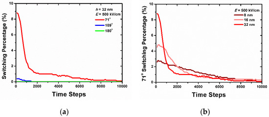 Analysis of domain switching behavior for different film thicknesses using an identical electric field: . (a) Switching percentage of different switching paths as a function of time in the film. (b) Percentage for 71 degree switching over time, with different film thicknesses indicated with different colors.