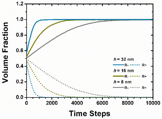 Here, we plotted the detailed volume fractions for upward variants R+ () and downward variants R- () in these samples in Figure 3. As the system evolved under an applied downward electric field, energy-unfavorable variants (in this case, the upward variants R+) disappeared over time. We used the vanishing point of R+ as the end of electric-field-induced polarization switching. In the 32 nm film, the volume fraction of R+ dropped to zero around Step 1000. In the 16 nm film, this drop occurred at Step 3000, and, in the 8 nm film, at Step 7000. With the decrease of film thicknesses, the time that was needed for the system to finish the switching process became longer.