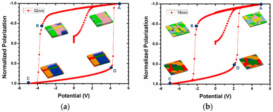 Hysteresis loops were calculated by applying dynamic electric potentials on top of the film, following the order . Consequently, electric fields were generated in directions downward/upward perpendicular to the film surface. Applying positive potentials on top of the film would result in a downward electric field, which further gave rise to downward polarizations (represented with negative signs in Figure 4). On the contrary, negative potentials led to the expansion of upward variants at the expense of downward ones. Domain configurations close to saturation polarizations (Points A and C) and coercive fields (Points B and D) were shown alongside the P-E loops. At Saturation Point A, domains were mainly formed by the four downward variants: . As the period of electric field gradually decreased from positive maximum to zero, polarization dropped slowly, suggesting high remnant polarization, especially in thick films. When the reverse electric field grew, particularly near the coercive field (Point B), opposite variants started to emerge around the domain walls, and their areas expanded over domains with the strengthening of electric potential, which was the result of the electric-field-induced polarization switching. As opposite polarizations reached a maximum (Point C), domains were mainly formed by the four upward variants: . In the process of a gradually changing electric potential from −5 V (Point C) to 5 V (Point A), polarizations in films switched from upward to downward via the turning Point D. As film thickness decreased from 32 nm in Figure 4a to 4 nm in Figure 4d, domain width decreased remarkably, which is a size effect—also reported in the literature [38,39].