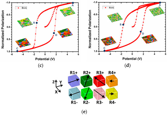 Hysteresis loops (P-E loops) for thin films with different film thicknesses: (a) 32 nm, (b) 16 nm, (c) 8 nm, and (d) 4 nm. Domain patterns for specific points are provided alongside the P-E loop. (e) Representative colors for eight rhombohedral variants in domain patterns.