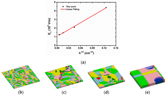 From Figure 5, the relation between coercive fields and film thicknesses can generally be expressed as , which has a similar trend as the well-known Kay-Dunn law () [40], but a greater value in power. This is because the Kay–Dunn law was derived from films with millimeter scale thickness, in which a switching process originated from nucleation. Yet in our work, the systems we studied are ultrathin films, and the polarization switching mechanism can be quite different due to the size effect [31,41]. We can see from the calculated domain configurations in Figure 5 that the domain width of the 4 nm film is much smaller than the width of the 32 nm film, which means that there are more domain boundaries in the 4 nm film. As seen in the figure, domain boundaries would block the process of domain switching, so thinner film will have a higher coercive field. The results that the coercive field decreases with increasing film thickness, and that thicker films have faster switching processes, confirm the general relation between switching time and coercive field [42]: , where is switching time, is applied electric field, and is corresponding coercive field.