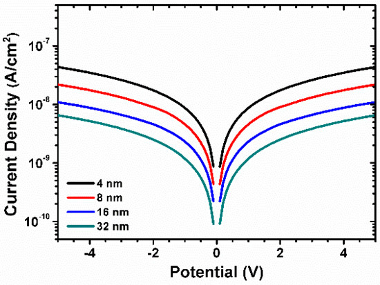 Additionally, I-V response is also an important character for ferroelectric films when they are subject to electric potentials. Therefore, we further studied the leakage current evolution under varying applied potentials [43]. The calculated I-V response for films with different thicknesses are shown in Figure 6. The leakage current density in BFO films increases markedly in samples with small thicknesses, indicating the limitations of application for ultrathin films.