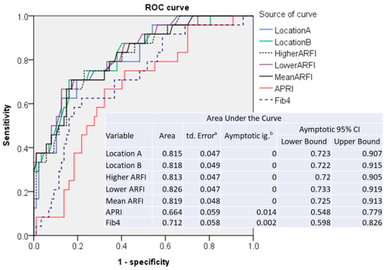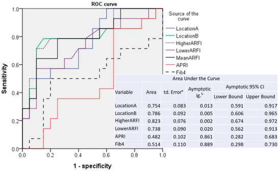 Data on ARFI were successfully obtained by two-location measurements from all patients. The diagnostic performance of ARFI and serum fibrosis markers for liver fibrosis was assessed using ROC curves. According to the data on two-location measurements, ARFI values measured at Location A or B, mean values of Locations A and B, and higher or lower ARFI data between Locations A and B were examined separately.