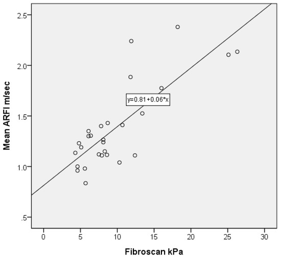 Twenty-seven patients had undergone both ARFI and FibroScan studies. All of these patients did not receive anti-HBV therapy at the time of elastography study. The correlation of mean ARFI with FibroScan is quite high. The Pearson correlation is 0.794 with a p-value < 0.001 (Figure 4).