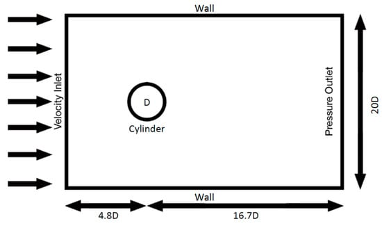Previous flow control work has predominantly focused on aerofoil geometries with air as the fluid. Recently, experimental investigations into active flow control for a circular cylinder in cross-flow have been conducted with water as the fluid, which have shown drag reductions of 20% to 29% [,]. Numerical approaches using large eddy simulation (LES) for active drag control for a two-dimensional cylinder in cross-flow by jet actuation have achieved drag reductions of 13%, as reported by Catalano et al. []. The optimum location of the synthetic jet orifice has been shown to be at a position perpendicular to the freestream []. Higher order methods such as the spectral element method are typically applied to direct numerical simulation (DNS) but have also been applied to LES []. More recently, spectral element or hp finite element methods have also been applied to more complex configurations [,]. The use of such methods allows for more accurate simulation of complete internal flows such as those of micropumps [,], which function similarly to synthetic jet actuators. In the present study, ANSYS Fluent will be used to conduct simulations. Currently, these higher order methods are unavailable for transient simulations in this commercial software package and therefore the unsteady Reynolds-averaged Navier-Stokes (URANS) computational fluid dynamics (CFD) approach with the transition shear stress transport (SST) turbulence model will be used instead, as described in more detail in Section 2. The numerical work presented here focuses on the effect of varying synthetic jet actuation frequency on drag and lift coefficients, pressure coefficient and the turbulence intensity in the wake of a circular cylinder in cross-flow.