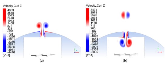 Vorticity plots for formation criteria set out by Holman et al. [] for a synthetic jet through two-dimensional simulation in quiescent flow at a fixed jet Stokes number = 15.8 and Reynolds number = 479 ( = 1.92), during the (a) blowing phase and (b) suction phase.