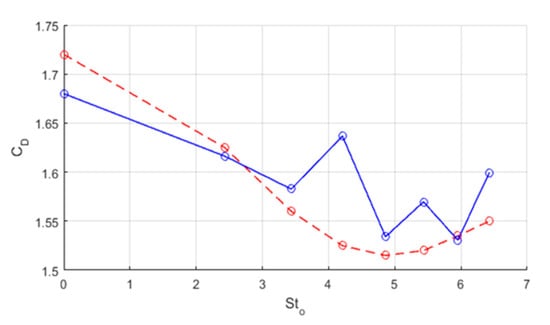 The work of Catalano et al. [] at = 3900 was used as a reference for the synthetic jet operating parameters of the present study. To the best of the authors’ knowledge, there are no DNS results or other LES simulation results available in the scientific literature for the case of a cylinder in cross-flow with the inclusion of a synthetic jet actuator. The results of Catalano et al. [] for a synthetic jet orifice located at to the freestream flow were not presented specifically for that location, but rather in a three-dimensional surface plot. The results for the drag coefficient against orifice location and actuation frequency were inferred from these results (Figure 5). To produce the same jet Strouhal number , Stokes number and Reynolds number , the pseudo diaphragm for the present study was driven at frequencies between 0.9 and 6.7 Hz, at similar conditions to Catalano et al. []. At these frequencies, a similar overall modification trend was observed, with decreasing overall from a jet Stokes number = 2.43 to 4.86 and then increasing again from = 4.86 to 6.43 (see Figure 5). However, a noticeable deviation from the results presented by Catalano et al. [] was observed at = 4.21. For this case, the pseudo diaphragm was driven at a frequency of 2.83 Hz, the same frequency as the natural shedding of vortices from the cylinder in cross-flow. This deviation from the overall trend could be the result of a weak feedback loop [] between the synthetic jet frequency and the cylinder’s vortex shedding frequency. Operating at frequencies from 50 to 360 Hz, Catalano et al. [] would have been well beyond the vortex shedding frequency and thus no feedback loop would be present.