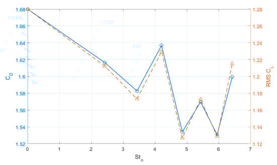 The root-mean-squared lift coefficient experienced by the cylinder was also altered by the variation of synthetic jet actuation frequency. The trend in the drag coefficient due to increasing the actuation frequency closely matched the modification in RMS lift coefficient (Figure 6). However, the same level of agreement in the and trends was not observed in experimental measurements in comparable conditions [,] and was not presented in other numerical studies [].
