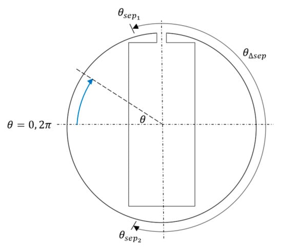 Schematic diagram of the near-field locations of interest on the cylinder surface: (i) stagnation point at the front of the cylinder ( = 0), (ii) top and bottom separation points and and (iii) the angle between both separation points .