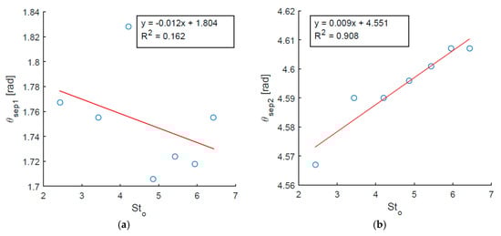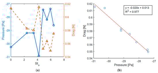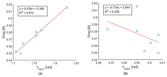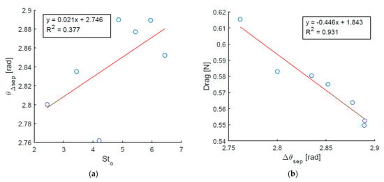 While the bottom separation point location shows a clear linear dependence on actuation frequency, this is much less pronounced for the top separation point. As such, the angle between the separation points is also just weakly correlated with the actuation frequency (Figure 10a). A stronger relationship is observed between and the drag force (R2 = 0.931). As increases, the drag force decreases (Figure 10b). This contrasts the known relationship between the separation point and drag for aerofoils, where delaying separation results in a drag reduction [,,,,].
