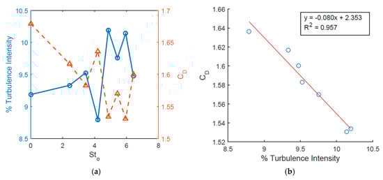 Effect of time and spatially averaged turbulence intensity at the rear of the cylinder on as a function of : (a) Change in turbulence intensity and with ; (b) Change in with turbulence intensity.