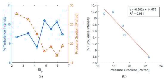 A positive correlation is found between the reduction in magnitude of the surface pressure gradient across the orifice (at ) and the turbulence intensity (at ). The perceived link between the two variables is most pronounced at the higher end of the frequency range under investigation, from a jet Stokes number between 4.2 and 6.4. Where the pressure gradient magnitude across the orifice decreases, a higher turbulent intensity is observed at the rear of the cylinder, suggesting agreement with other published results [,] on the advantageous increase in momentum of the fluid downstream of the orifice, thus modifying (Figure 13a).