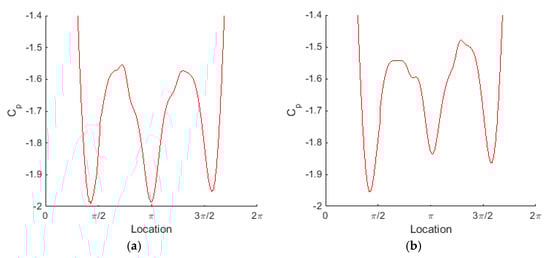 Exactly how these mechanisms affect the surface pressure coefficient can be seen more readily upon closer inspection of Figure 13 and Figure 14. Since the stagnation pressure remains unchanged across the range of actuation frequencies, a direct comparison of plots can be carried out. Comparing two cases of jet Stokes number = 2.43 and 4.86 (Figure 14), the corresponding increase in turbulence intensity from 9.4% to 10.2% appears to transform the pressure distribution, decreasing the magnitude of all maxima and minima of (Figure 14). It appears that the bulk of the drag reduction is due to the reduction in the pressure magnitude between and and hence the reduction in the positive force in the direction (Equation (7)). It is interesting to note the asymmetry when comparing the = 2.43 case (Figure 14a) with the = 4.86 case (Figure 14b). The asymmetry of the time-averaged results offers little correlation between the degree of asymmetry and the drag reduction; only the decrease in the pressure magnitude accounts for this reduction.