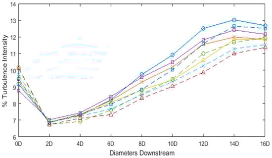 The downstream flow domain was observed from the lee of the cylinder at a distance ranging from zero to 16 diameters (16) downstream. For the spatial averaging aspect, the properties of the flow domain were recorded along a series of lines extending in the direction and spaced 2D apart from 0 to 16 from the lee of the cylinder. As previously mentioned, the turbulence intensity at the freestream velocity inlet was fixed at 5%. How the turbulence intensity downstream of the cylinder varies with actuation frequency can provide valuable information for wind or tidal turbine arrays, particularly if the jet operating conditions that yield the minimum drag coefficient and RMS lift coefficient values were to have a negative effect at far field downstream locations, e.g. in the form of increased turbulence intensity. This turns out not to be the case, as described below.