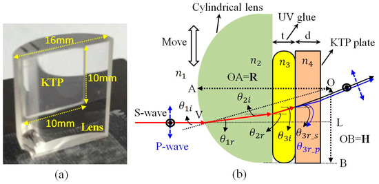 Figure 1 shows the photo and geometric drawing of the proposed CDS for lateral displacement measurements. Figure 1a is the photo of the fabricated CDS showing the main dimensional sizes. As marked in the photo, the width and height of the cylindrical lens (LJ1155L1, Thorlab, Newton, NJ, USA) are 16 and 18 mm, respectively. The radius and focal length are 10.2 and 19.7 mm, respectively. In another cylindrical lens (Model LJ1909L1, Thorlab, Newton, NJ, USA), the width and height are 13 and 15 mm, respectively. The radius and focal length are 7.1 and 13.7 mm, respectively. The thickness and length of the square shape KTP plate are 1 and 10 mm, respectively. The same dimensional KTP plates were used for the two different cylindrical lenses. Figure 1b illustrates the ray traces and angle variations of the probe light in the CDS. A cylindrical lens (n2) was attached to the KTP (n4) using UV glue (n3). The probe light in the air (n1) was perpendicular to the flattened side of the cylindrical lens. The CDS was placed on a moveable micro-displacement piezoelectric transducer (PZT) stage (Model MAX312D/M, Thorlab, Newton, NJ, USA), and the probe light was fixed. The incident angle is changed with the displacement of PZT. O is the center of the cylindrical lens with a radius of OA = R. The probe light transmits onto the semispherical surface at position V. The extension line VL is parallel to OA, which is perpendicular to the flattened side OB of the CDS. The refractive angle through the KTP can be controlled depending on the probe beam positions. There are two initial positions, and the corresponding distances OL = 1/2H and 3/4H were used in the experiments. Therein, a half width of the cylindrical lens is expressed as OB = H. According to Snell’s law, the initial incident angle at the air-lens interface is defined by:
