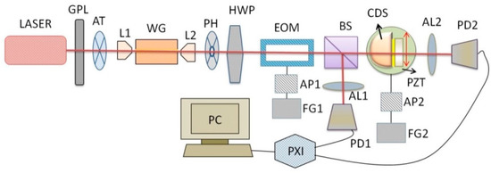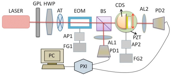 To compare the displacement measurement performance depending on the characteristics of a beam spot, therein the OLB from a stabilized He-Ne laser with a wavelength of 632.8 nm (Model R-32734, Newport Corporation, Irvine, CA, USA), and the measurement setup shown in Figure 2 based on the dual-channel homodyne interferometer [17], was used. The OLB with a vertical polarization was obtained using a Glan-Thompson polarizer (GPL). A half-wave plate (HWP) at an azimuth angle of 22.5° was used to obtain two orthogonal polarizations of equal amplitude. The input optical power was controlled using an attenuator (AT). An electro-optic modulator EOM (Model 4002 New Focus, Newport Corporation, Irvine, CA, USA) was used to modulate the phase delay between the two polarizations. The EOM was driven by a function generator (FG1) and voltage amplifier (AP1). The amplitude and frequency of the applied sinusoidal voltage were 105 V and 1 kHz, respectively. The voltage induces the corresponding phase modulations used in the homodyne interferometry. The incident light was divided into two paths via a non-polarization beam splitter (BS). The reflected light passing through an analyzer (AL1) was received by a photodetector (PD1). The reflected signal was used to monitor the photorefractive induced phase noise from the EOM. The CDS was placed on the PZT stage driven by a function generator (FG2) and a voltage amplifier (AP2). According to the product specifications from the vender, displacement is around 40 µm at an applied voltage of 150 V onto the stage. The transmitted light passed through the CDS, and an analyzer (AL2) was then received by a photodetector (PD2). The transmitted light was used to measure the phase variations caused by the displacement. Both the interferometric signals of the reflected and transmitted paths were connected to a multichannel data acquisition module (PXI). A fast Fourier transform (FFT) scheme was adopted to decide the measured phase variations [18], and this phase information was displayed on a personal computer (PC). The common phase noise can be effectively reduced by synchronously measuring the phase variations of both channels [17].