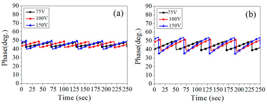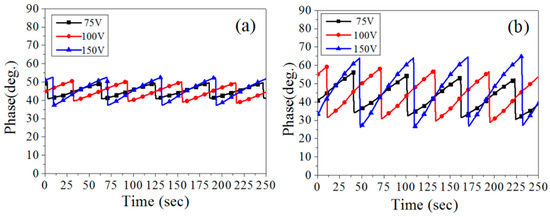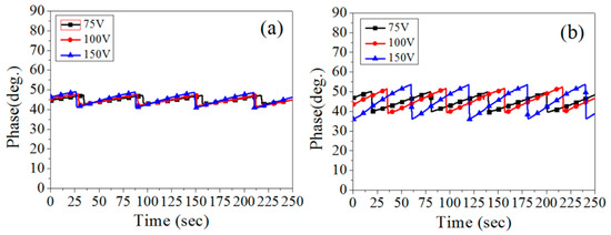 Phase response for the different applied voltages using the GWB and CDS of R = 7.1 mm at different incident positions: (a) 1/2H and (b) 3/4H.