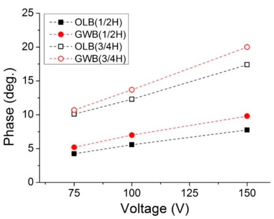 Phase vs. applied voltage at the different incident positions (R = 10.2 mm) for the GWB and OLB.