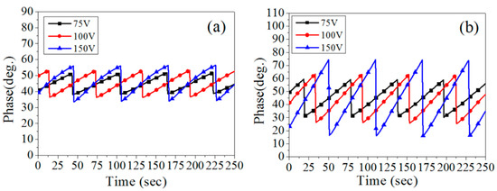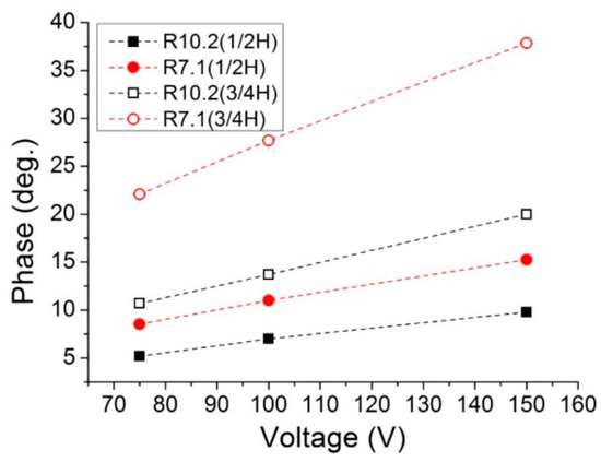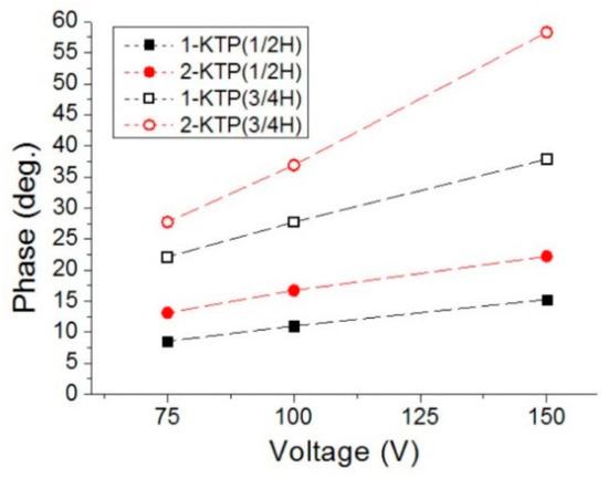 In previous experiments, the CDS was fabricated using only a single KTP plate (1-KTP) attached to the cylindrical lens since phase variation is also proportional to the thickness of the KTP plate. Furthermore, a CDS made of two adhesive KTP plates (2-KTP) was explored to compare measurement sensitivity with that of a CDS using 1-KTP. Figure 10 shows the relationship between the phase variation and the applied voltage using the CDS with R = 7.1 mm and 2-KTP plates. At position 1/2H, the maximum phase variations are 13.1°, 16.7°, and 22.2° for the three applied voltages 75, 100, and 150 V, respectively, as shown in Figure 10a. At position 3/4H with the previous voltage conditions, Figure 10b presents the phase variations: 27.7°, 36.9°, and 58.3°. The summarized results of phase-to-applied-voltage at different incident positions for the CDS of R = 7.1 mm with the different 1-KTP and 2-KTP plates shown in Figure 11. Figure 12 shows the summarized results of phase versus displacement at the 3/4H position for the different CDSs when the PZT stage has 150 V applied (displacement = 40 µm).
