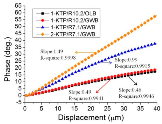 The slope and R-square after a linear fit on these phase curves can be further calculated to compare performance on the different CDSs. The slope is expressed as average displacement sensitivity. In comparing the different radii of 1-KTP CDS probed by the GWB at the position 3/4H, according to Equation (10), the simulation values of DS are 0.45 and 0.98°/µm and the experimental values are 0.49 and 0.99°/µm for R = 10.2 mm and R = 7.1 mm, respectively. The close proximity of values in the simulations and the experiments indicate that the fabrication and application of the 1-KTP CDS are easily achievable. The largest slope of 1.49°/µm in displacement ranging from 0 to 40 µm with R-square of 0.9998 was achieved when probed by the GWB at the position 3/4H on the 2-KTP CDS of R = 7.1 mm. The system phase stability is around 0.007°, and the resolution of 4.7 nm is achievable. In an ideal situation, the slope of the phase curve shall be around 1.96°/µm due to the increased (double) thickness of the KTP plate in the 2-KTP CDS. However, the experimental value of 1.49°/µm is smaller than the simulation value of 1.96°/µm. The increased thickness of KTP plates gradually induces the non-ignored walk-off between two orthogonal polarizations to possibly reduce the DS. This means that the KTP plate will be optimized for the maximum thickness.