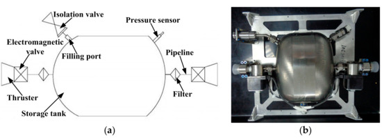 A micro-satellite propulsion system is limited by the performance, installation space, and weight. Chemical propulsion, electric propulsion, and laser propulsion systems have further limitations, such as a complex structure, a large volume, and a large weight [24,25,26]. Hence, they cannot be applied to micro-satellites. A pico-satellite or nano-satellite has a smaller volume and weight. Therefore, the installation and volume utilization rate of the propulsion system becomes more of a prominent problem. Currently, a pico-satellite mainly uses a storage tank propulsion system that is a high-pressure, thin-walled storage tank [27,28]. Owing to the requirements of the processing method, pressure, and weight, conventional propulsion storage tanks are oval or spherical in shape. When the storage tank occupies the same installation envelope, the volume utilization rate is low. To fully utilize the installation space for a pico-satellite, the conventional storage tank must be changed to a complex or special-shaped storage tank. A rational design can effectively improve the strength and volume utilization rate, and can reduce the weight [29,30].