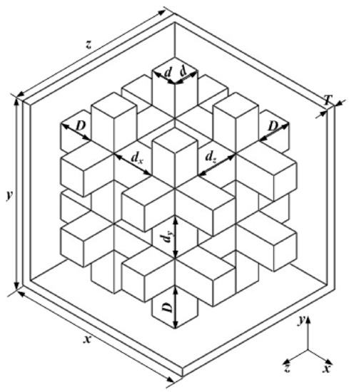 The internal structure utilizes a mesh structure in order to further optimization. This is a single column structure with a square or circular cross shape. When the envelope of the storage tank uses the shape shown in Figure 2, the structure of the storage tank is determined by the length of the mesh structure, three direction intervals , , and , wall thickness , and the connecting distance to the side wall , as shown in Figure 3.