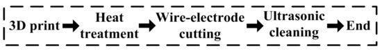 To obtain the properties of the 3D printing material, three tensile specimens are pre-printed. The size of the pre-printed tensile specimens are as follows: length of 80 mm and diameters of 20 mm and 15 mm. The related introduction for additive manufacturing and post-processing steps for pre-printed tensile specimens are show in Table 2 and Figure 4. The dimensions of tensile specimens are selected based on the recommended dimensions of the Instron 3382 tensile testing machine (Instron, Boston, MA, USA). In Figure 5, the print direction, 3D printing specimens, tensile specimen size, tensile test, and true stress–strain [39] diagram of the material are shown. The final mechanical properties of the specimens are given in Table 3.