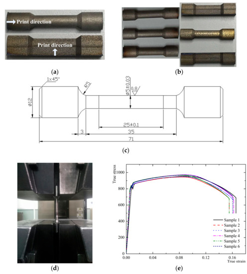(a) The print direction; (b) 3D printing specimens; (c) tensile specimens size; (d) tensile test; and (e) true stress-strain of material.