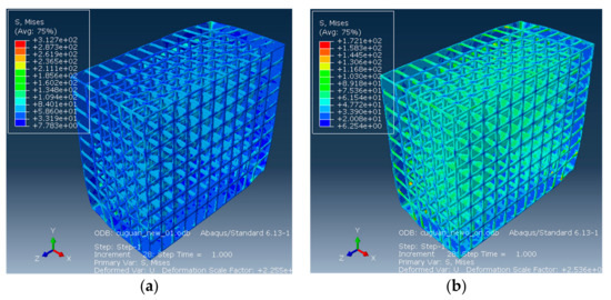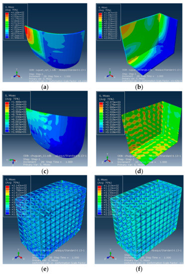 The analysis results of the strength of the storage tank are shown in Figure 6. The stresses of the four kinds of storage tanks used are 417 MPa, 1357 MPa, 1488 MPa, 2737 MPa, 214 MPa, and 122 MPa, respectively. The results show that the thinner walled storage tank can reduce mass, but it can be subject to greater stress, buckling, and rupture, as shown in Figure 6c,d. The improved mesh structure with the square column structure can withstand a greater pressure load. Hence, we abandon the schemes of Figure 6c,d.