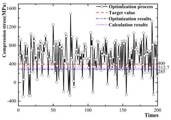 Compression stress optimization process, optimization results, and calculation results.
