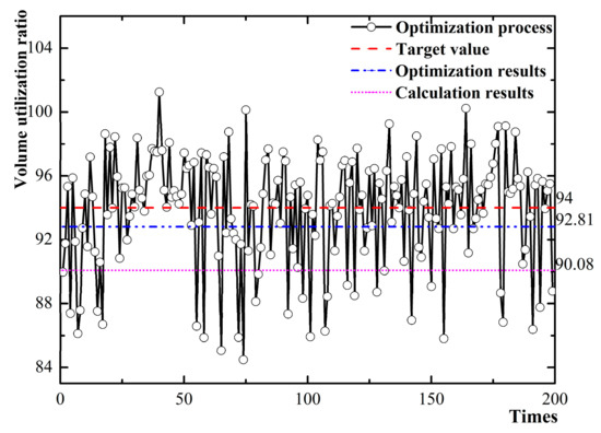 Volume utilization ratio optimization process, optimization results, and calculation results.
