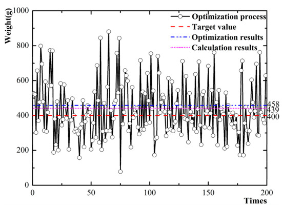 We use 1stOpt software to optimize , , and , where the detailed optimization settings are shown in Table 10. When , , and are set to the target values, we can obtain the values of each parameter. According to the orders of the six factors affecting , , and , and in order to facilitate the processing, modelling, and calculation for the final printing, the final value of each parameter is selected to be equal or greater than the optimal value of each parameter. The optimal values are listed in Table 11. The optimization process, optimization results, and calculation results are shown in Figure 7, Figure 8 and Figure 9, respectively.