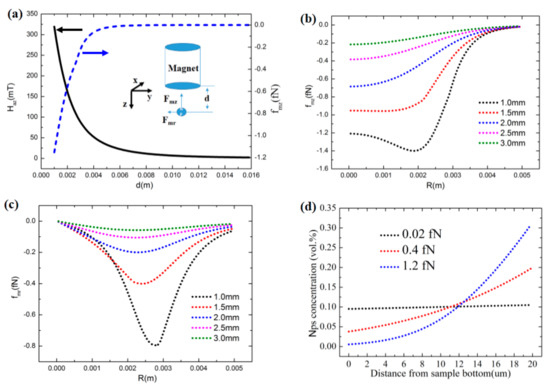 (a) Magnetic field and force distribution in the z direction of magnet; (b,c) magnetic force in the axial and radial directions in different locations; (d) concentration distribution after 1.2 × 103 s with different applied forces.