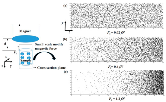 As shown in Figure 4, when the scale is small, a gradient distribution of concentration will be formed due to the diffusion process. However, when the size scale increases (e.g., 2 mm), the magnetic force will be the dominant driving force. A particle will be driven to the left side, where the magnetic force is larger than that on the other side of the sample. Another important problem is that particle accumulation is much slower than in a small-scale case. As seen from Figure 4a (2 mm case), the gradient distribution of the whole scale is difficult to obtain.
