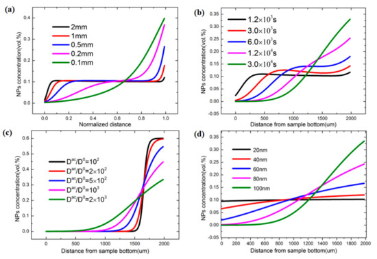 (a) Nanoparticle concentration along the normalized distance (e.g., distance from sample bottom divided by sample thickness) for sample thicknesses ranging between 0.1 and 2.0 mm at a sufficiently long processing duration of 1.2 × 104 s; (b) real-time evolution of the particle concentrations for a 2.0-mm (2000 μm) thick sample when the diffusion constant is 2000 times larger, and the magnetic particle radius is 100 nm; (c) nanoparticle concentration evolution after 1.2 × 104 s when particle size is fixed, and the diffusion constant is changed; (d) nanoparticle concentration evolution after 1.2 × 104 s when the diffusion constant is fixed, and the nanoparticle radius is changed.