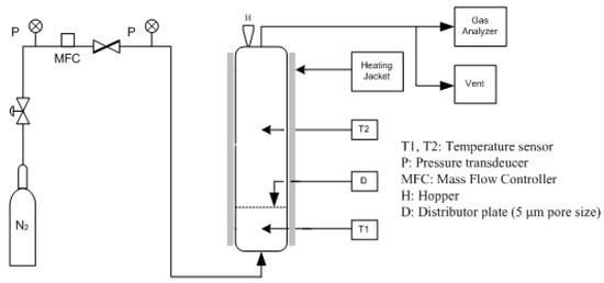 A laboratory scale downdraft fixed bed made of stainless steel was used for the torrefaction of sewage sludge. The bed height was 600 mm with an internal diameter of 30.7 mm. The schematic diagram of the bed is provided in Figure 1. Thermocouples were used to measure temperatures of the inlet gas, the bed, and the reactor wall. Calorific value was measured using bomb calorimeter (Parr Instrument Co., Model 1672, Moline, IL, USA), whereas for elemental analysis Thermo Fisher Scientific INC., Thermo FLASH 200 (Hudson, NH, USA) was used. In addition MK9000 (Eurotron Instruments, Chelmsford, UK,) gas analyzer was used to analyze the emitted gas during torrefaction. 200, 250, 300, and 350 °C temperature range along with 0–50 min of residence time was used for this study. American Society for Testing and Materials (ASTM) D3172 method was used for calculating proximate analysis of raw and torrefied sludge.