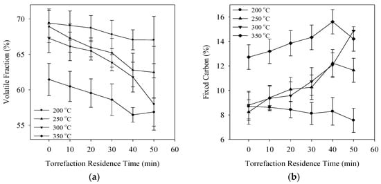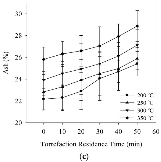 Other important parameters that contribute for the characterization of solid fuel are volatile matter and fixed carbon, which are also partly responsible for the alteration of calorific value [27]. As demonstrated in Figure 3a,b torrefaction has an opposite effect on these two operating parameters. With an increase in torrefaction temperature and residence time, it can be observed that the fixed carbon and ash increases whilst the volatile fraction decreases. The torrefied product is desired to have less volatile fraction and more fixed carbon as it amplifies the calorific value of the torrefied product. For 300 °C, there was a decrease of 13.77% in the volatile content, whereas an increase of 68.95% was observed for fixed carbon. Least changes were observed for 200 °C for both volatile fraction and fixed carbon. Although the highest value for fixed carbon is for 350 °C, the net gain in the value is minimal when compared to 250 and 300 °C. With an increase in torrefaction residence time and temperature, the ash content increased and the highest was for 350 °C. The increase in the ash content was primarily due to the mass loss during the torrefaction process. Similar results were obtained by Park et al. [28]. Improved fixed carbon value of torrefied biomass can be an advantage as it aids the heat of combustion improving the efficiency of the overall combustion applications [29]. In contrast, an increase in the ash content can have a negative impact on the usage of the torrefied product as a higher ash content is associated with fouling, slagging, and agglomeration of the bed [30]. A study by Deng et al. [31] demonstrated a decrease of 38.88% in the volatile content, whereas Mani [32] achieved only 7.8% decrease in the volatile content, the differences in the value was due to the types of the biomass that were used for the pretreatment process. The former was high due to the high volatile content that was present in the agricultural residue when compared to the latter, which considered woody biomass [33].