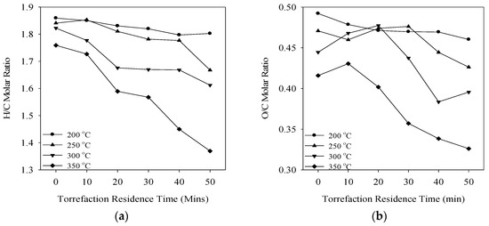 The molar ratios of hydrogen and oxygen with respect to the relative carbon content i.e., O/C and H/C ratios are substantial parameters for the characterization of fuel composition. From Figure 4, for both molar ratios, torrefaction at 200 °C did not have much of a significant effect, but with an increase in torrefaction temperatures from 250 to 300 °C presented a significant decrease. At 350 °C, for both H/C and O/C molar ratios, a steep decrease was observed. Whereas, a gradual decrease in the H/C molar ratio at 250 and 300 °C was achieved. For O/C at 300 °C, a slight increase was observed until 20 min residence time, after which the fall in the O/C value was noticeable. These alterations in the molar ratios are primarily due to the release of bound water and are also due to the fractional removal of oxygen by decarboxylation, and dehydration reactions [34]. This decrease consequently increased the gross calorific value, which in turn decreases the volatile content. In addition, with an increase in torrefaction temperature and residence time, the hydrogen and oxygen content of the torrefied product decreased, resulting in reduction of the H/C and O/C ratios. Therefore, it can be seen from the graph that the increase in torrefaction temperature and residence time provoked a reduction in the O/C and H/C molar ratios due to the loss of carbon in the form of carbon dioxide, light hydrocarbons, and water. Moreover, a similar reduction trend of O/C was observed by Sandeep et al. [35] in their study for lignocellulosic biomass. Reduction in the oxygen and hydrogen content strengthens the fact that the hydroxyl groups deteriorate during torrefaction. Moreover, from an energy density perspective, C–C bond projects higher energy compared to C–O or C–H bonds as the relative increase in carbon content results in better calorific value. Increase in the relative carbon content and decrease of other elements, such as O, N, H, and S may also result in a decrease in the volatile fraction.