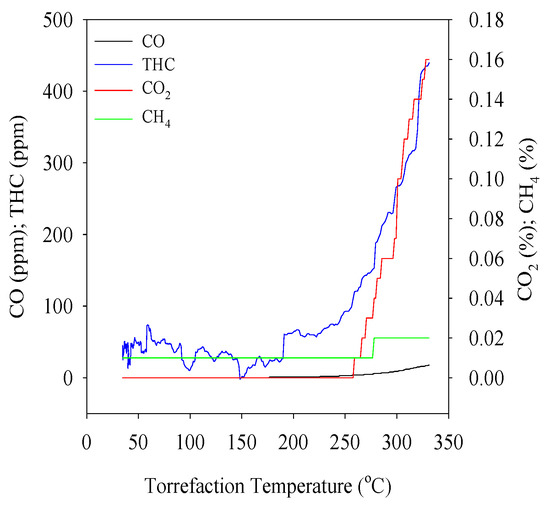 Increase in torrefaction temperature also favors the generation of gases, such as carbon monoxide (CO), carbon-dioxide (CO2), thermal hydrocarbon (THC), and methane (CH4), which is demonstrated in Figure 5. The gas analysis was carried out independently in order to study the gases that are emitted during the torrefaction of sewage sludge. The gas emission was not studied for different residence time. Rather, a continuous emission test from 50 to 350 °C was conducted to study the emission properties during torrefaction. CO2 and CO were released after 250 °C, whereas CH4 was released approximately after 270 °C and only subtle traces of THC is generated until 240 °C. This increase in the CO2 is associated with the decarboxylation of the acid group, as explained by White and Dietenberger [36], whereas methane is produced due to the cracking and de-polymerization reactions [31]. As aforementioned, the decarboxylation reaction occurs at an elevated temperature, which is also supported by the production of CO2 and CO [37]. Various researchers have proposed 300 °C as the optimal torrefaction temperature [38,39]. From the results obtained in this study, it can be concluded that 250–300 °C can be considered as the optimum temperature for the torrefaction of sewage sludge. The difference in the optimum temperature range obtained in other research to this research may be due to the different types of biomass that were used i.e., lignocellulosic and non-lignocellulosic biomass.