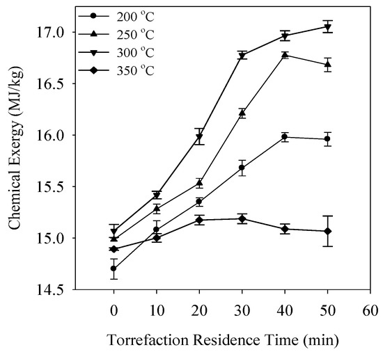 From Figure 6 it can be seen that the overall increase in chemical exergy increases with increase in torrefaction residence time and temperature. At 200 °C, there is a gradual increase in the exergy but a significant increase is observed at 300 °C followed by 250 °C and the least value is projected by 350 °C. The graph obtained for chemical exergy can be correlated with O/C molar ratio and degree of torrefaction. The decrease in the O/C molar ratio is due to the increase in the relative carbon content which in turn increases the chemical exergy. This may be due to the fact that elemental oxygen present in the biomass operates as an oxidizing agent instead of combustible matter in contrast to the elemental carbon of the biomass, which undergoes oxidation during the chemical reaction releasing heat, which can be converted to work. In addition, the trend followed by degree of torrefaction and chemical exergy is comparable. For 200–300 °C, the degree of torrefaction and chemical exergy increases with an increase in torrefaction residence time. At 350 °C, the degree of torrefaction decreases with an increase in residence time; whereas, there is a negligible increase in the chemical exergy. This again can be associated with the increase in calorific value of the biomass due to the increase in the relative carbon content with the increase in torrefaction residence time. The highest value of exergy obtained in this study was 17.05 MJ/kg for 300 °C at 50 min residence time. The greater the value of exergy the greater is the useful work of the torrefied biomass, which in turn can enhance the thermochemical processes, such as pyrolysis, combustion, and gasification. For better-torrefied yield product on the basis of chemical exergy it can be concluded that 250–300 °C can be used as the optimal torrefaction temperature for sewage sludge.