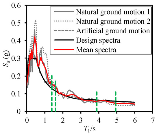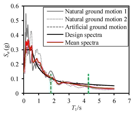 The fundamental periods of the isolated structure are 4.294 s and 4.242 s for the Y direction and the X direction, respectively. Based on the Tf and Tis values, three ground motions, including two natural ground motion records and one artificial ground motion, are selected according to GB50011-2010 [17]. The response spectrum of each ground motion is compared to the design response spectrum as shown in Figure 15. It can be found that the mean response spectrum agrees well with the design response spectrum at the periods of Tf and Tis. Subsequently, THAs are conducted for these two structures. The critical design indexes, including β under DBE, MBD under the MCE, and are calculated. The critical design indexes and parameters are presented in Table 5.