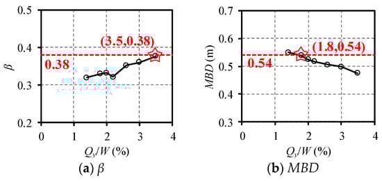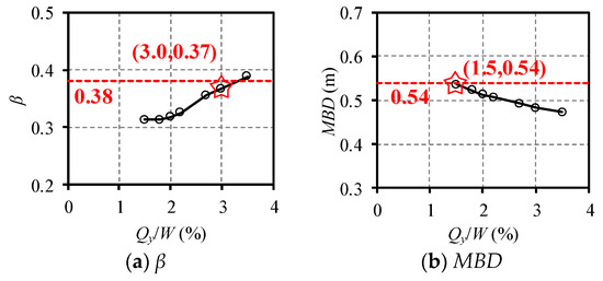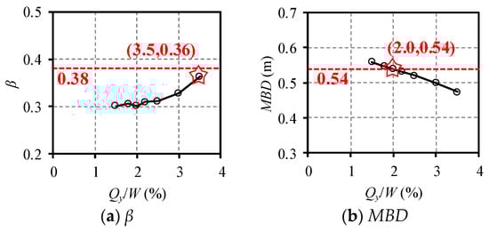 The values of β and MBD for the 28 study cases with different yield ratios and different seismically isolated schemes are calculated and presented in Figure 4, Figure 5, Figure 6 and Figure 7. The following conclusions can be drawn: