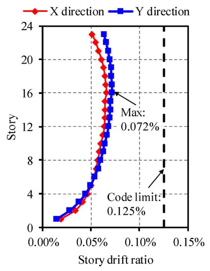 The appropriate Tf is calculated using Equation (1) with a value of 1.77 s. Hence, the superstructure is designed with a Tf of 1.798 s and 1.697 s for the Y-direction and the X-direction, respectively, which can approximately satisfy the requirement. The section size and the concrete strength of the superstructure are listed in Table 4. The total gravity load of the entire structure is 617338 kN. The distribution of the inter-story drift ratio of the superstructure under response spectrum analysis is presented in Figure 13. The corresponding maximum inter-story drift ratios of the X and Y directions are 0.066% and 0.072%, respectively, which are both lower than the limit value (i.e., 0.125%) specified in the GB50011-2010 [17].